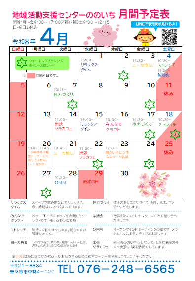 ランチ、体力づくり、創作活動など曜日ごとに活動があります。自由参加です。